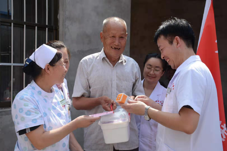 近日,万荣县贾村乡大甲村村民谢石玄老人,拿到该乡卫生院医务人员送来的家庭小药箱时十分高兴。
