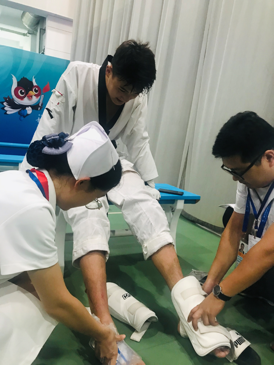 8月12日晚8时,二青会跆拳道比赛体校组的铜牌争夺战开赛前夕,17岁的四川小将石凯文忍着脚伤从医院回到了赛场。
