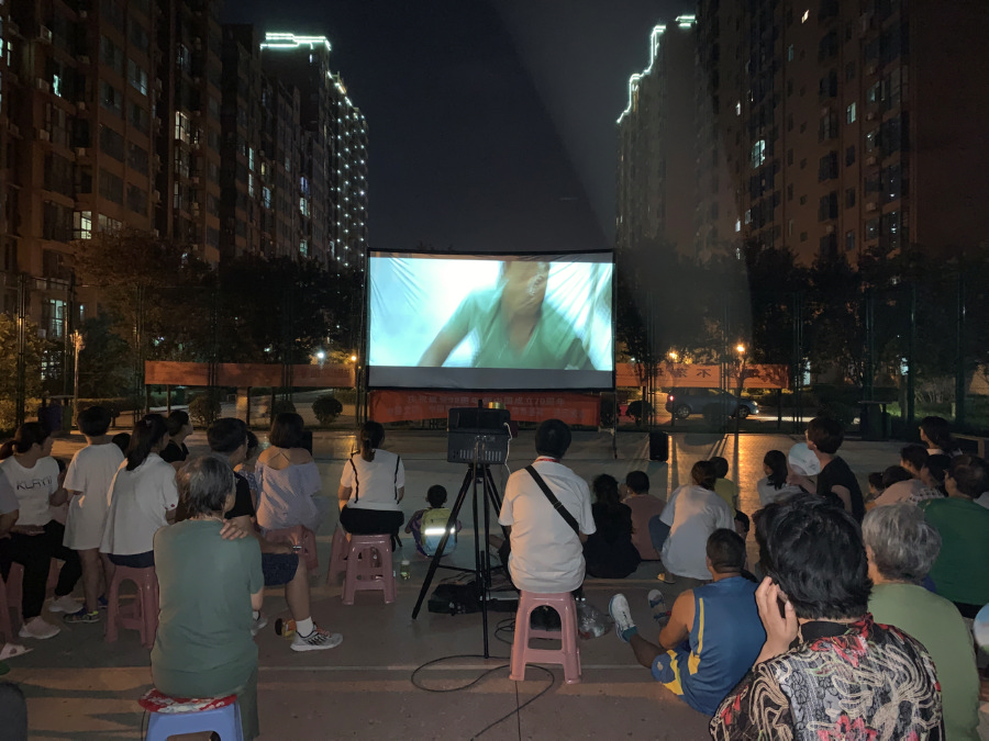 活动现场,晚风习习,红色电影《战狼2》在御景华庭小区篮球场放映,百余名居民从家过来观看电影。观影时,演员爱国的情怀、专业的演技和真实的场景引起居民的共鸣,当看到电影高潮部分时,有的居民讨论电影情节,有的为电影欢呼。