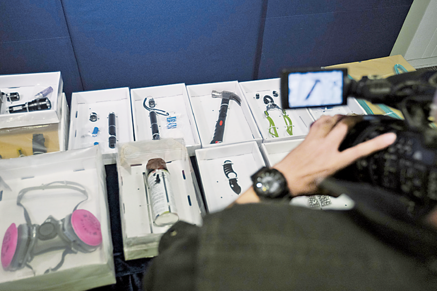 ▲在香港警察总部,记者在拍摄警方展示的证物。 新华社发