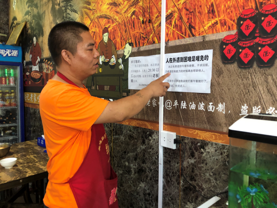 8月13日下午,记者来到位于市区凤凰小区东门的平陆油泼面馆,一进门便注意到贴在店内北侧墙上的一张告知,上面写着“人在外遇到困难是难免的,本店免费提供午餐和晚餐,不求回报,只希望你有能力的时候再去帮助他人。提示:只要您小声告诉我们要午餐就行了,找地方坐,吃完走人”。指着墙上贴的这张通知,张彦峰谈起了自己与妻子这样做的缘由。