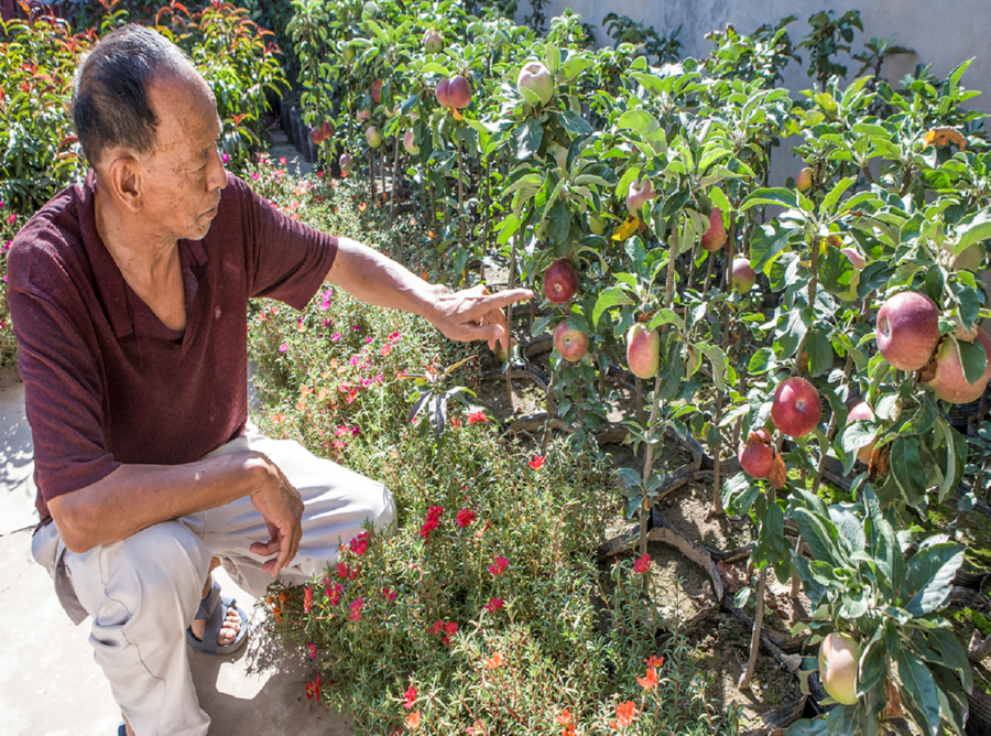 3年前,王建温从新疆引进适宜盆栽的苹果嫁接成功。今年,他利用院内空间培植的2000多盆独枝苹果开花挂果。盆栽苹果在室内摆放既可观赏,又能品尝,颇受人们青睐。如今,院内即将成熟的苹果已经红透,迎接着客商前来观果购货。 特约摄影 李克荣