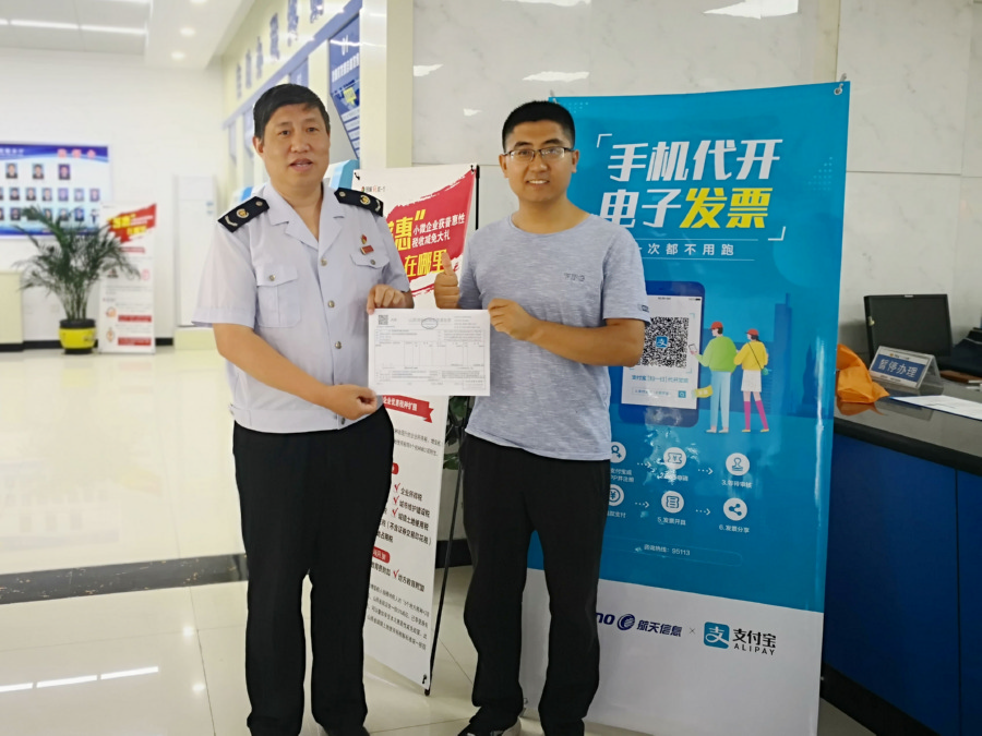8月14日,自然人员克年(右)展示国家税务总局平陆县税务局用手机为其开具的发票。