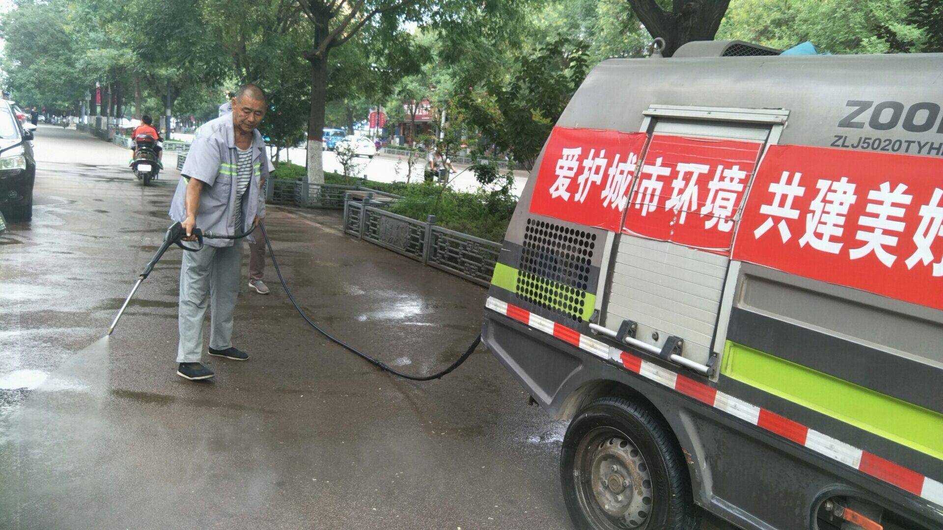 ▲在市区红旗街,工人在冲刷路面。 祁克宁 摄