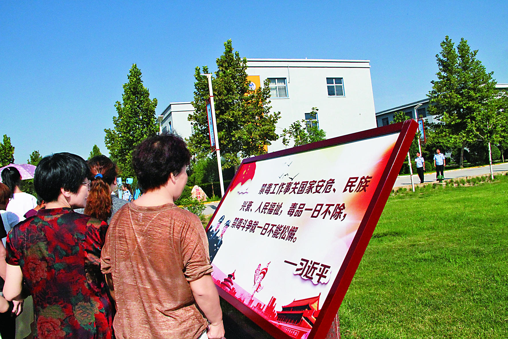 董村戒毒所民警职工家属在戒毒宣传版面前驻足 本报记者 张君蓉 摄