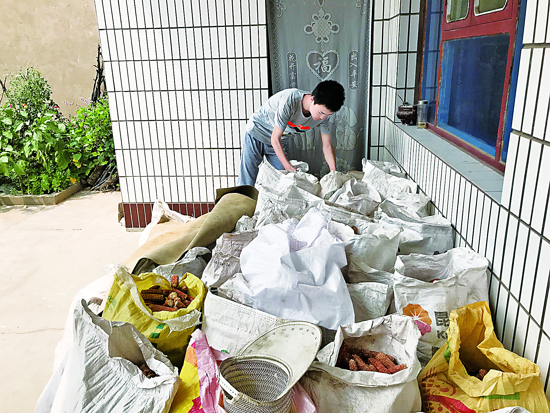 ▲刚从地里干完农活回来的南博龙在忙着搬玉米芯 刘凯华 摄