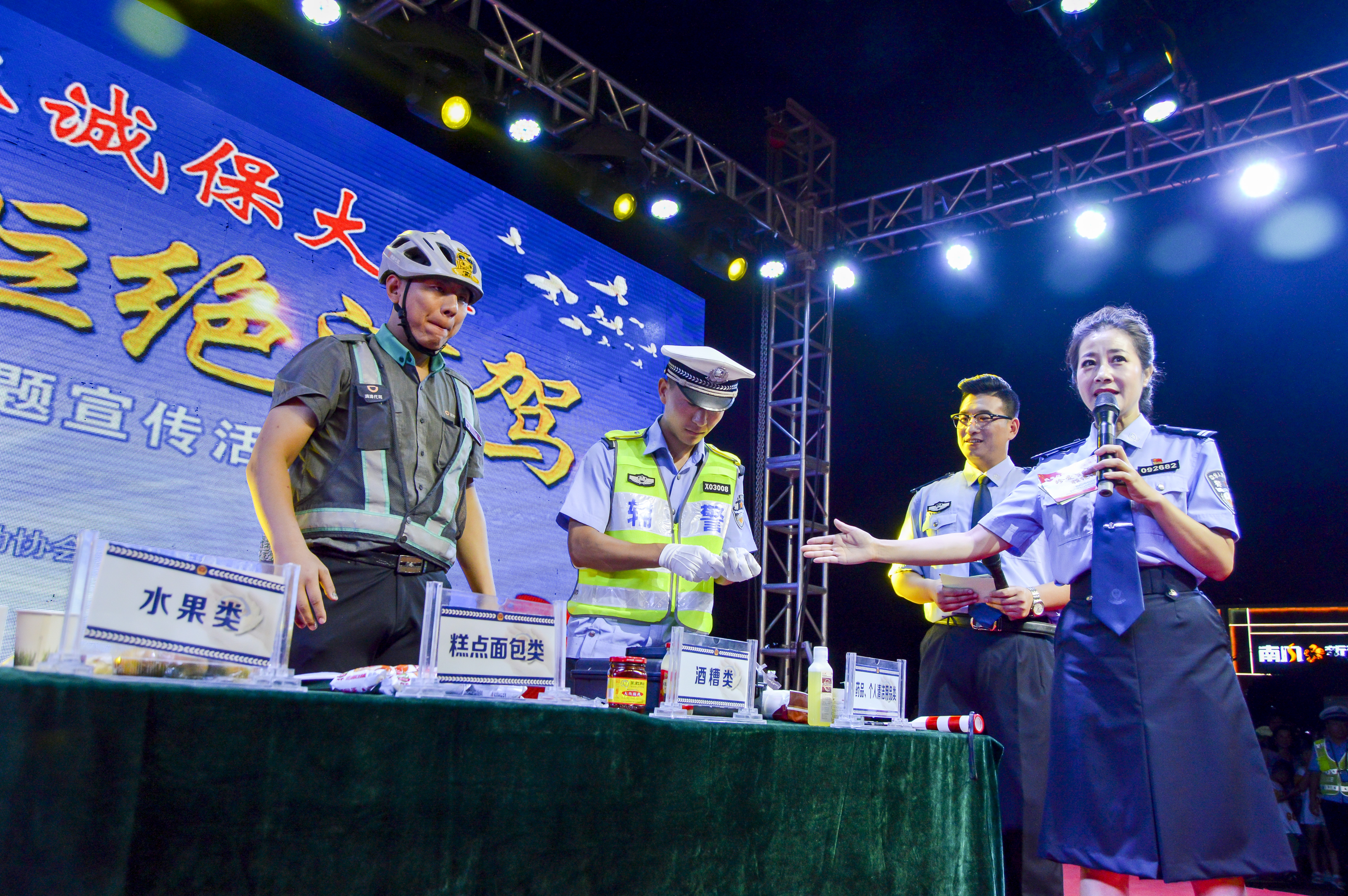 “酒后挪车算不算酒驾?哪些食物容易引起‘被酒驾’?”主持人提出问题后,台下的观众讨论了起来。在节目演出间隙,民警通过交通安全知识有奖问答的形式与现场观众互动。在食用含酒精食物后检测酒精环节,现场来自各行各业的观众纷纷参与其中,在台上吃起了蛋黄派、荔枝等容易“被酒驾”的食物。同时,参与答题活动的蛋糕制作店老板、滴滴代驾司机、驾校教练等,从自身出发,将自己所掌握的酒驾相关知识分享给现场群众。