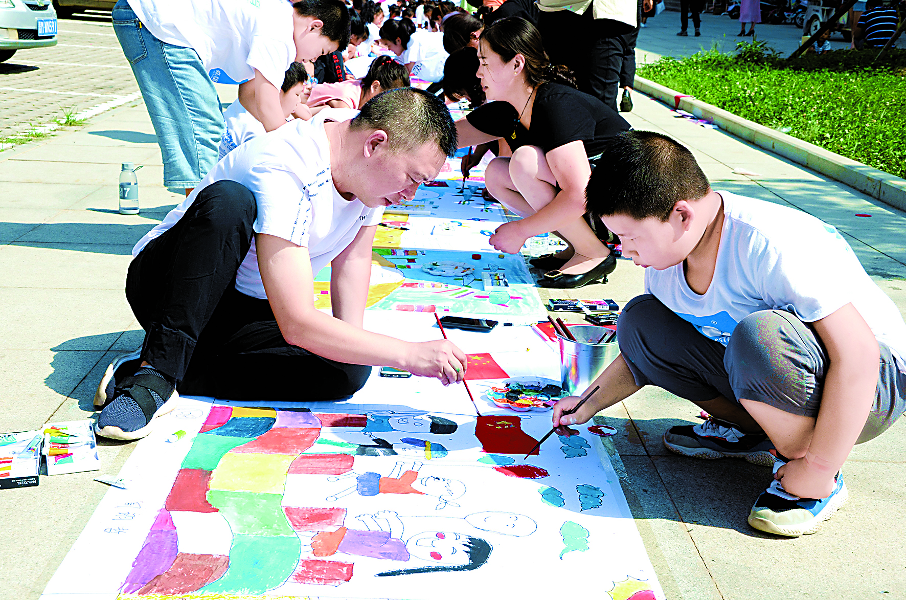 8月17日,万荣县解店镇南薛朝村的周诩哲小朋友和父亲一起绘制歌颂祖国的画卷。