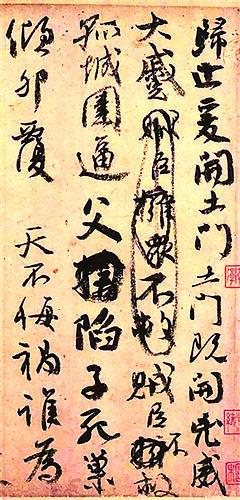 《祭侄文稿》一共23行,234字。由于情感激越,这些文字时疏时密,墨色有重有轻,甚至有“枯笔”的痕迹。颜真卿长期积累的书法功力在悲壮的情绪下挥洒而出,有极强的艺术感染力。