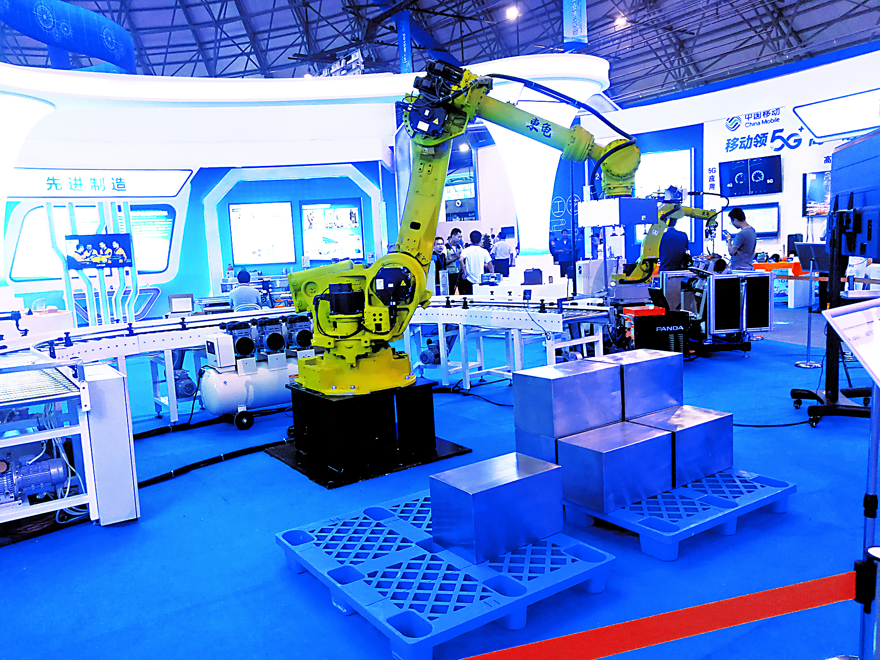 在工作中,焊接机器人本体运行高度可达180m/min,在空间曲面可以精准焊接,而且粉尘较少,可以不间歇工作;搬运机器人本体重复定位精度可达±0.1mm,最大延伸可达2650mm,可直接将需要搬运的货物放进产送带,最大承载可达165kg,两条“手臂”的强大功能令现场参观的嘉宾啧啧称奇。
