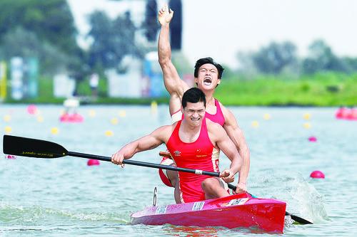 ▲8月24日,刘浩/王浩(后)在夺冠后庆祝。 当日,在匈牙利塞格德举行的皮划艇世锦赛男子双人划艇1000米比赛中,中国组合刘浩/王浩以3分40秒55的成绩获得冠军,同时获得东京奥运会参赛资格。 新华社/美联
