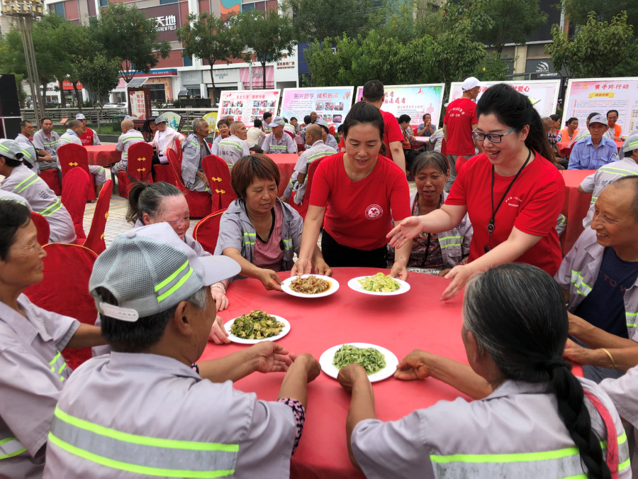 当天,在市区南风广场西侧,市第一时间爱心公益志愿者联合会和南风百货请来200余名环卫工,共同见证“爱心早餐”坚守的第1000天。简短的启动仪式后,该联合会爱心艺术团的演员或登台演唱激情飞扬的流行歌曲;或打开唱腔即兴来一段精彩的蒲剧,让环卫工人在这里能暂时停歇脚步、放松心情。随后,志愿者端来几盘可口的饭菜和饺子宴请环卫工人。在环卫工人吃完饭准备离开时,志愿者又拿出早已准备好的晴雨伞送给这些“城市美容师”,为他们遮阳挡雨。