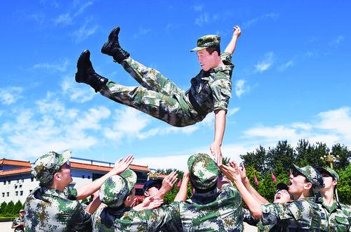 ▲8月27日,季新杰(前右)与队友一起将教官抛起。 当日,中国国家游泳队军训公开课在北京八一军体培训中心进行。新华社发