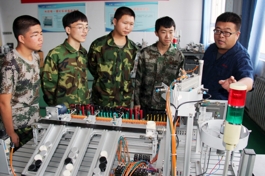 8月27日,中信集团中信机电制造公司五四一高级技工学校电气自动化专业的教师,在光电一体化实验室指导学生进行实训。