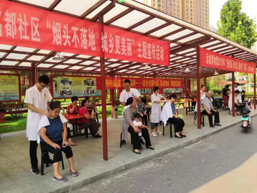 “阿姨,中医推拿,对老人、青年、儿童、妇女都适用,是一种普遍应用的自我保健方法。”志愿者赵林洋与一位居民正在交谈。“你照着我教的手法在家就可以做,经常按摩可以促进身体血液循环,保养身体。”他说。