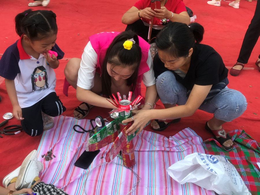 在跳蚤市场,孩子们发挥自己的想象力,在家长的帮助下,把不用的塑料瓶、易拉罐、一次性杯子、纸箱等废旧物品,通过粘、绑、插等方式改造成机器人、飞机、储物盒等作品,并将改造好的作品及自己平时不常玩的玩具标上价格,与现场的小朋友互换、互购。在社区工作人员及志愿者的指导下,每个小朋友都换到了自己想要的礼物,满意而归。