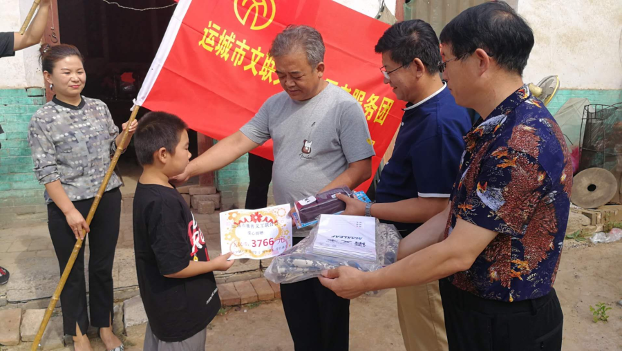8月31日上午一大早,运城市慈善义工联合会二十多位志愿者代表,以及市文联文艺志愿者服务团诗词学会分团的会员们,集体前往盐湖区陶村镇翟曹村看望一名10岁的困难孩子,为他送去了志愿者募集的3766元爱心款以及书包、文具等学习用品。