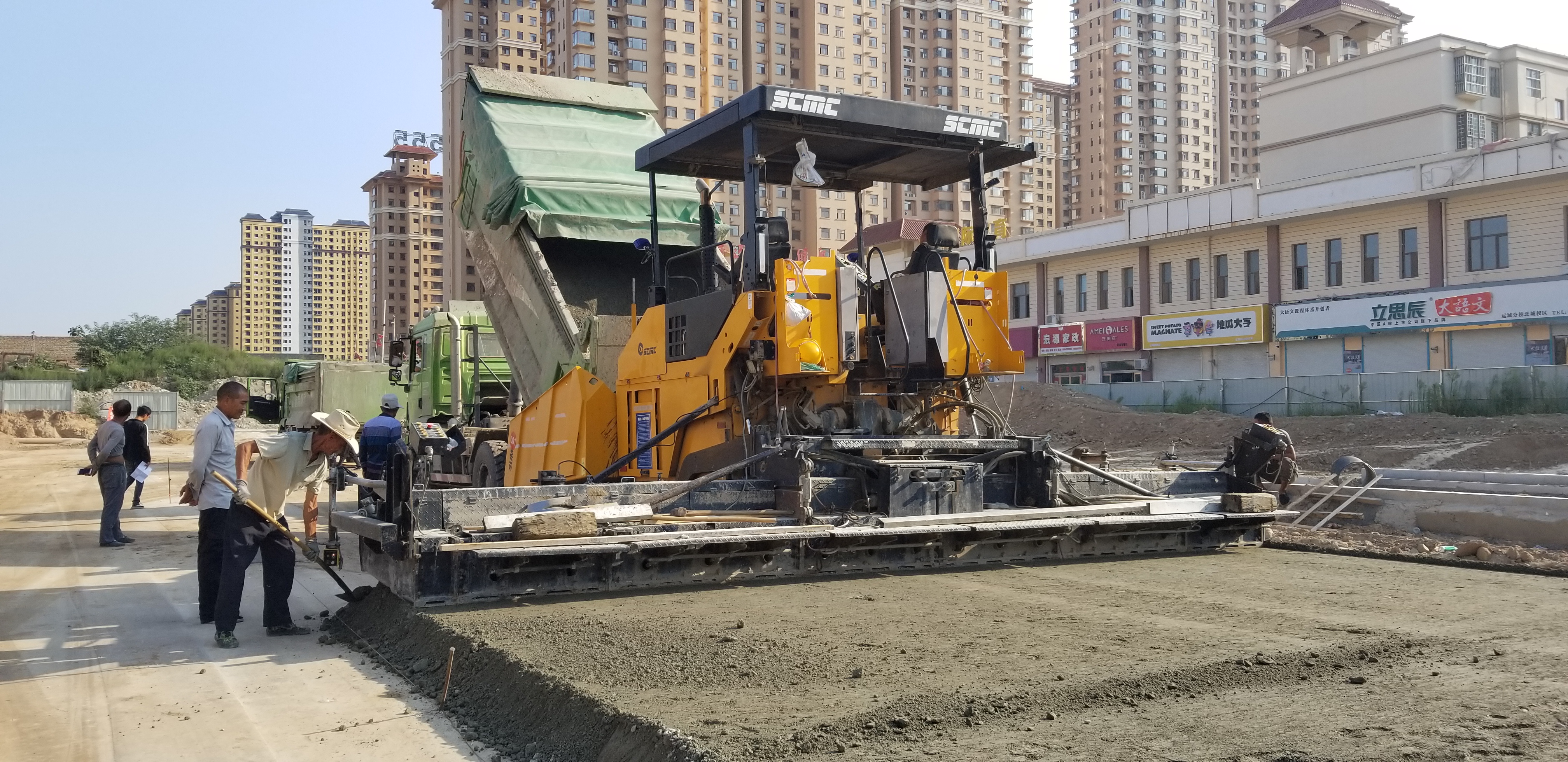 9月3日,记者在市区槐东北路涑水街至岳南街路段看到,摊铺机正在进行摊铺作业。