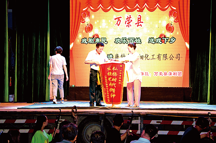 ▲8月30日晚,万荣县康特尔精细化工有限公司将一面锦旗赠送给万荣县蒲剧团(上图),表示对蒲剧团不辞辛苦到企业演出的谢意。