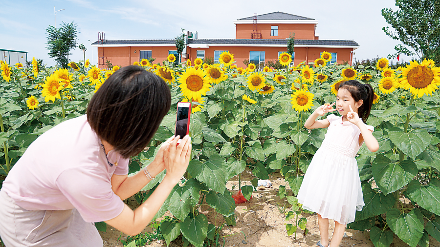 ▲8月31日,在运宝高速芮城服务区,一对母女在盛开的油葵花前拍照。