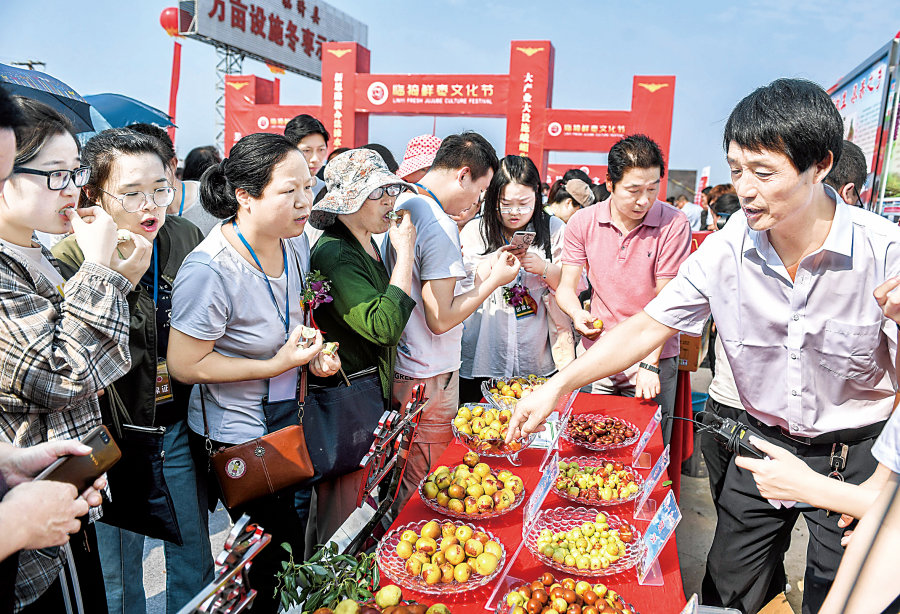 9月5日,与会人员在“临猗鲜枣文化节”开幕式现场参观品尝鲜枣。 记者 薛俊 摄