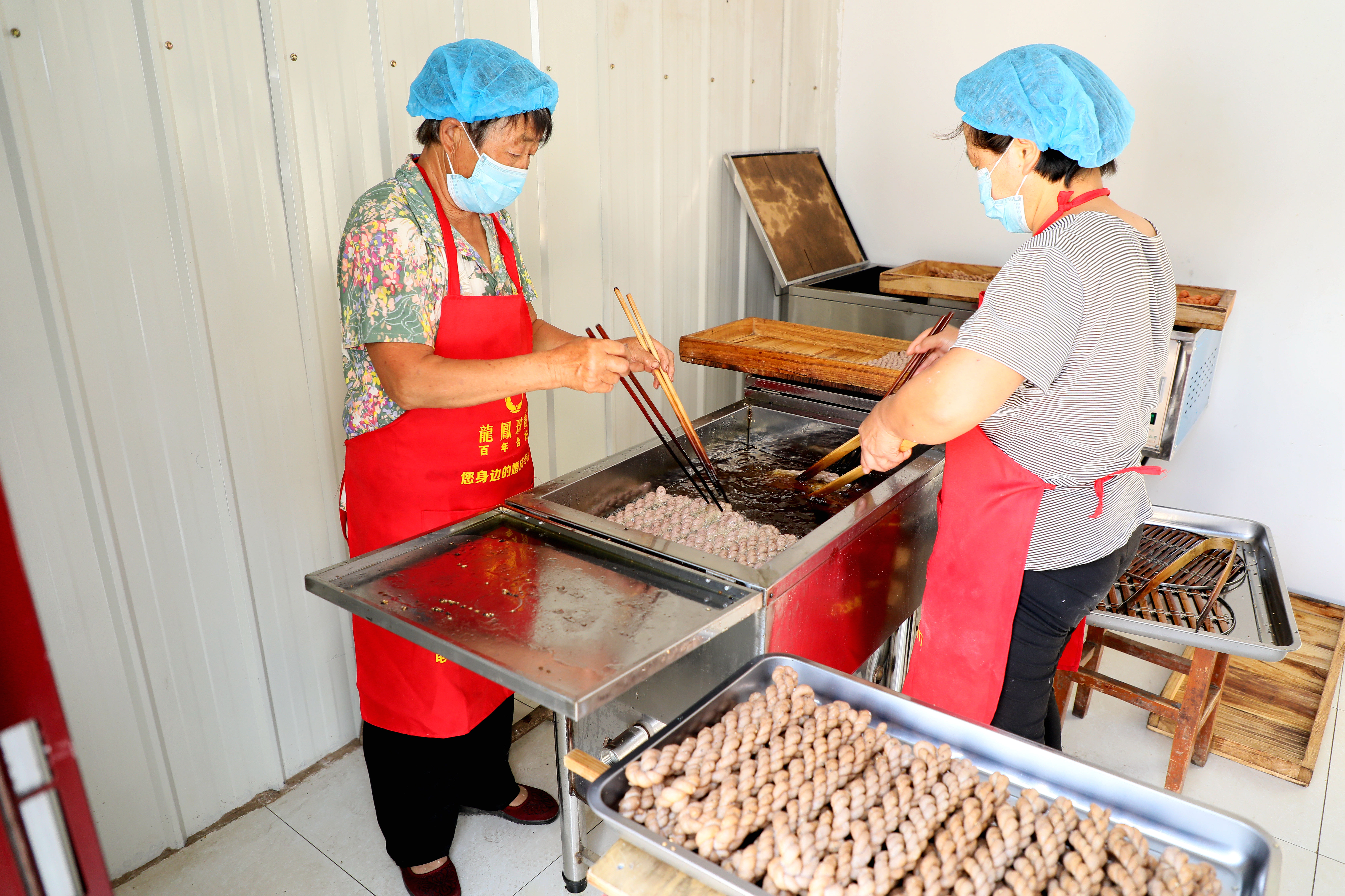 在新盖的厂房内,行新枝(右)在炸制麻花 本报记者 王运涛 摄
