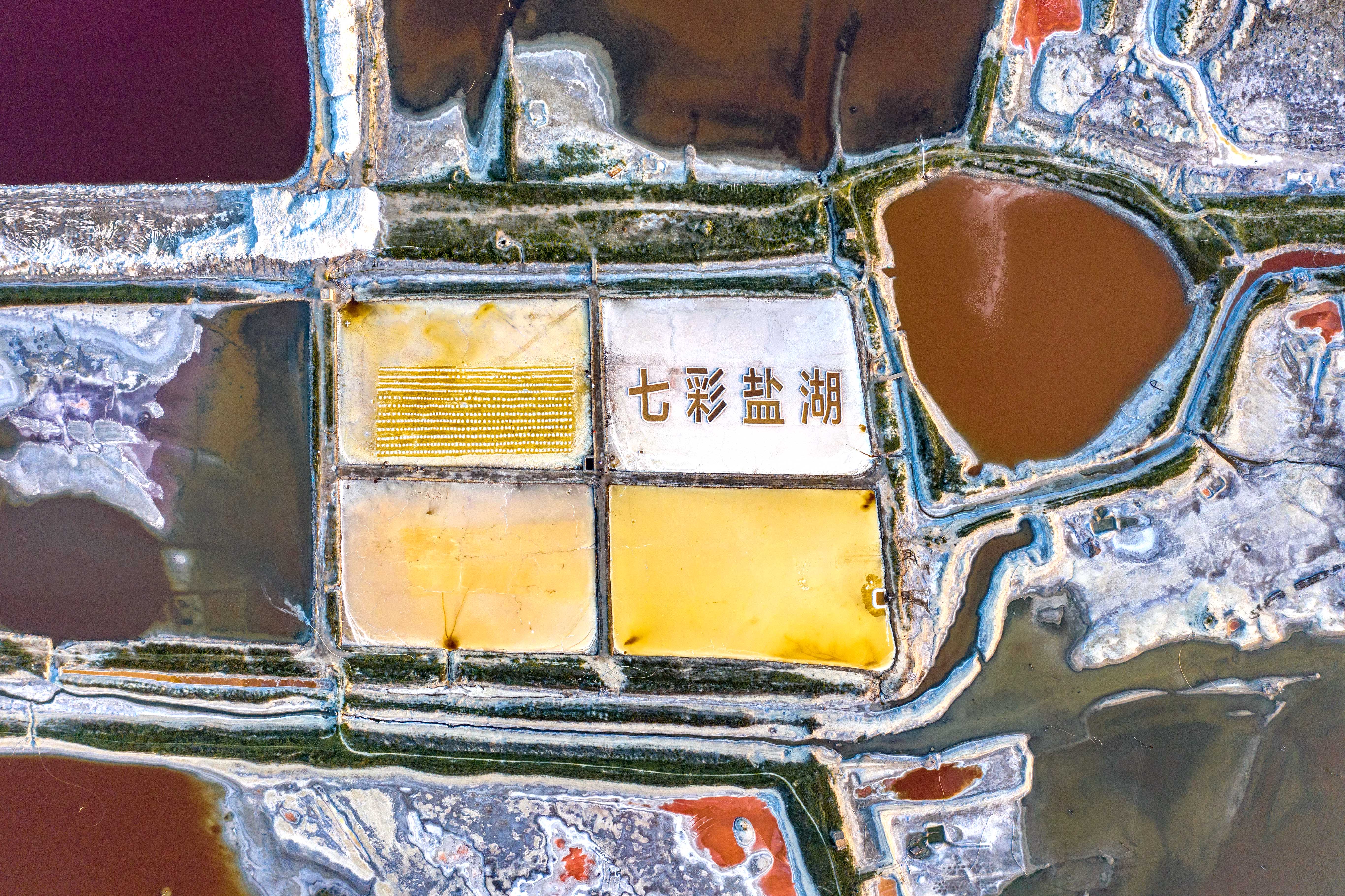 9月7日,在运城盐湖拍摄的“七彩盐湖”四个大字景观。