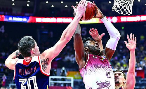 ▲9月8日,俄罗斯队球员库拉金(左)在比赛中防守委内瑞拉队球员科梅纳雷斯的进攻。 当日,在广东佛山举行的2019年国际篮联篮球世界杯小组赛第二阶段比赛中,委内瑞拉队对阵俄罗斯队。新华社记者 薛玉斌 摄