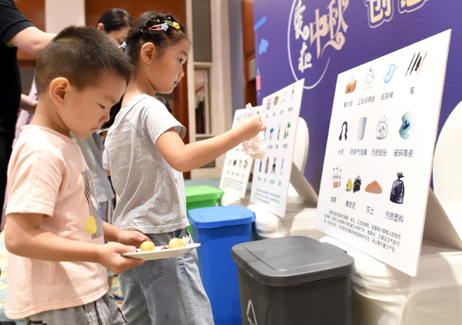 9月7日,小朋友们将活动现场产生的垃圾进行分类投放。