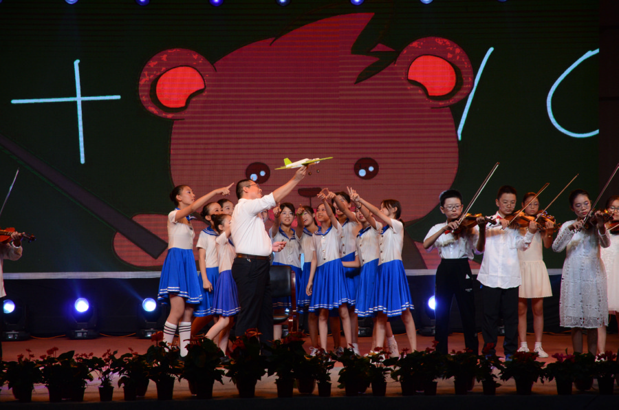 东康中学的庆祝活动以“爱国”“理想”为主题,弥漫着浓浓的家国情怀。活动伊始,7000多名师生齐唱国歌,接着2600名初一新生合唱《歌唱祖国》。两首歌曲气势磅礴、排山倒海,唱毕全场欢呼声震耳欲聋。最后的压轴节目,是在教师合唱队的引领下,全场高歌《我和我的祖国》,现场气氛达到高潮。家委会成员在诗朗诵《我想对你说》中,希望孩子“自始至终都能成为理想主义者,相信自己,相信别人,相信阳光明艳,相信天空蔚蓝,也相信世间总是温暖”。
