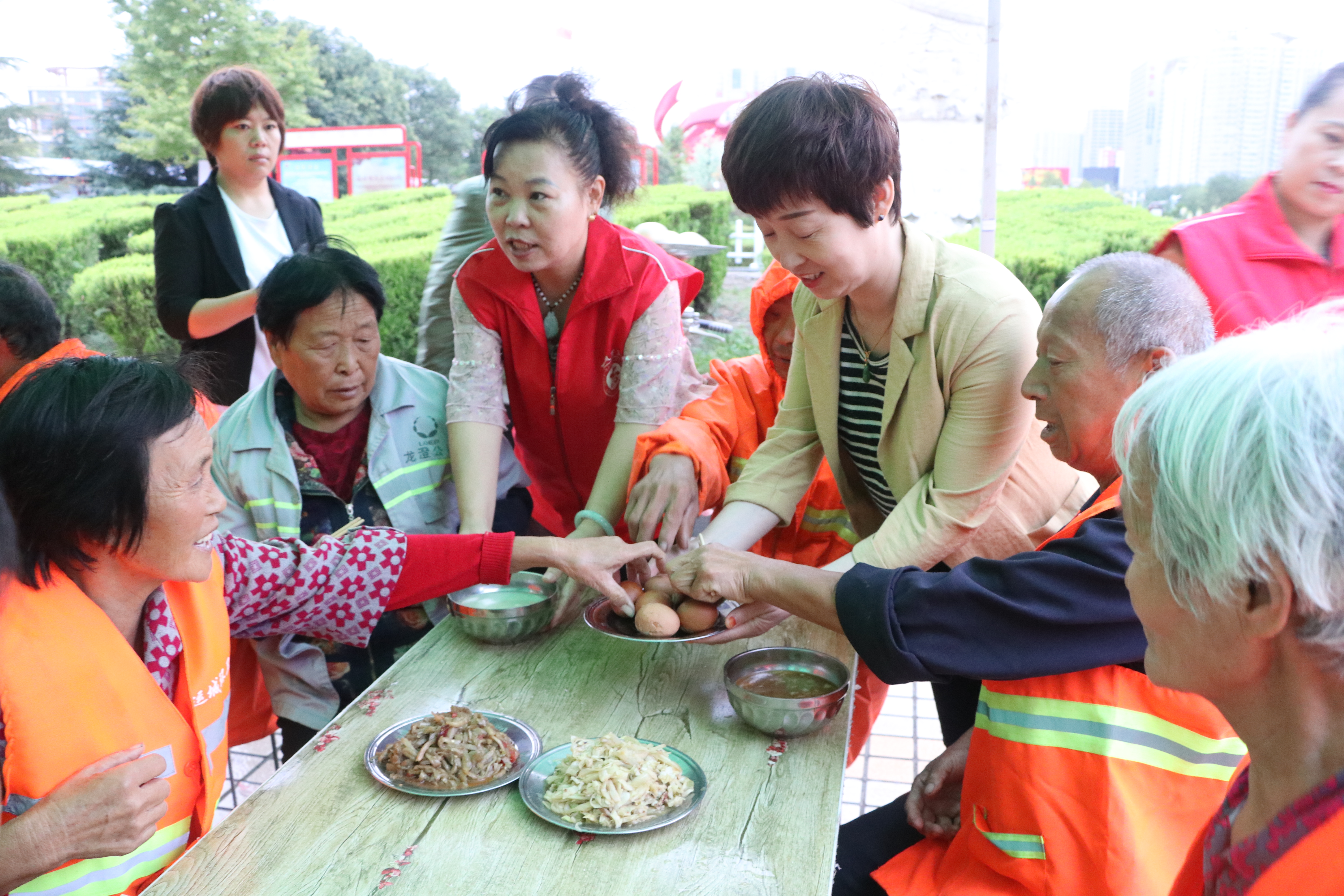 ▲志愿者为环卫工发放鸡蛋 王棉 摄