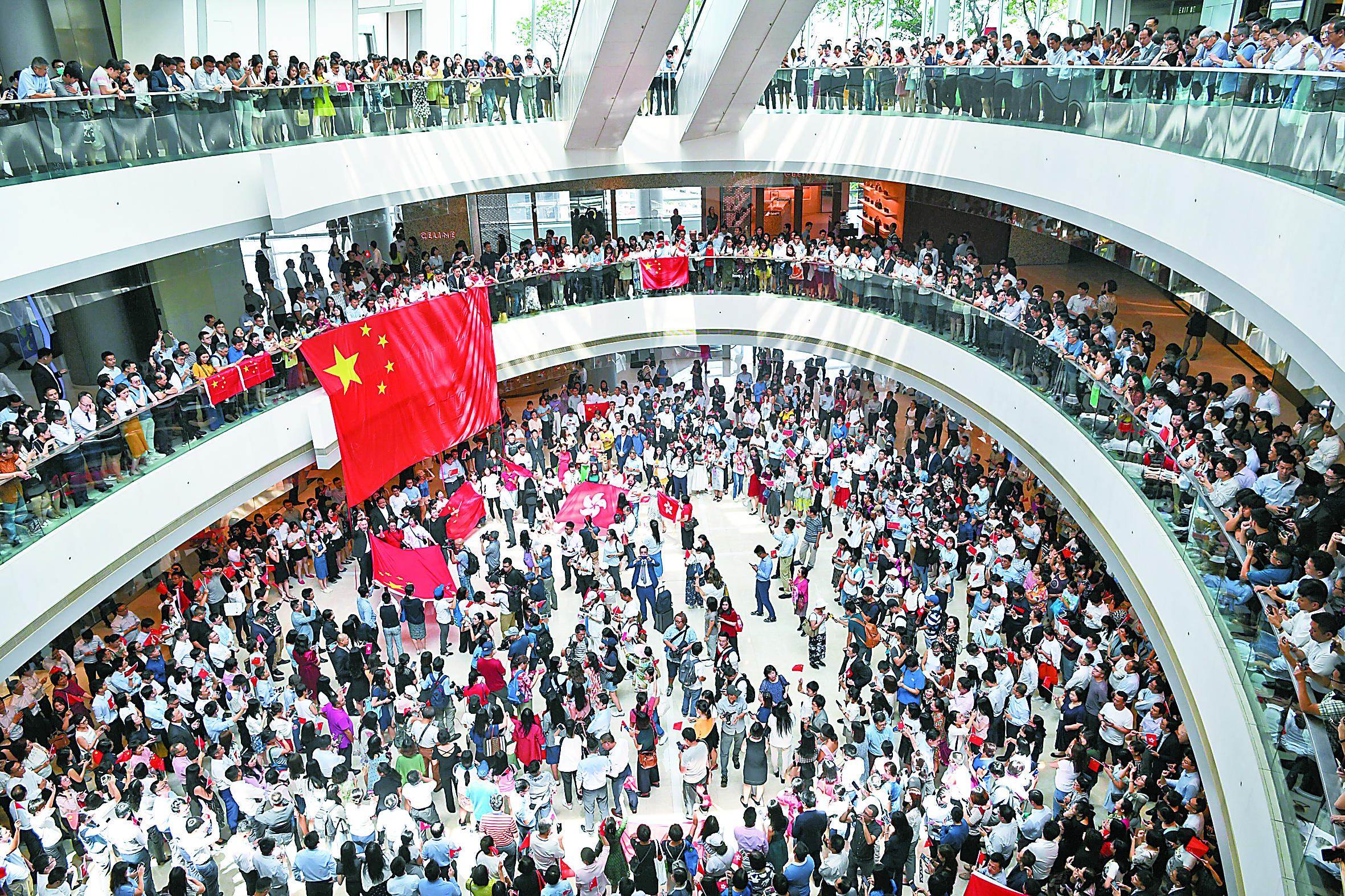 13时,快闪正式开始。楼上楼下1000多人,摇动红旗,齐声高唱中华人民共和国国歌和《歌唱祖国》,强大的共鸣声震耳欲聋。期间,人们不时鼓掌并高喊“祖国万岁”“中国加油”“香港是中国的”“中国香港加油”“支持香港警察”等口号。