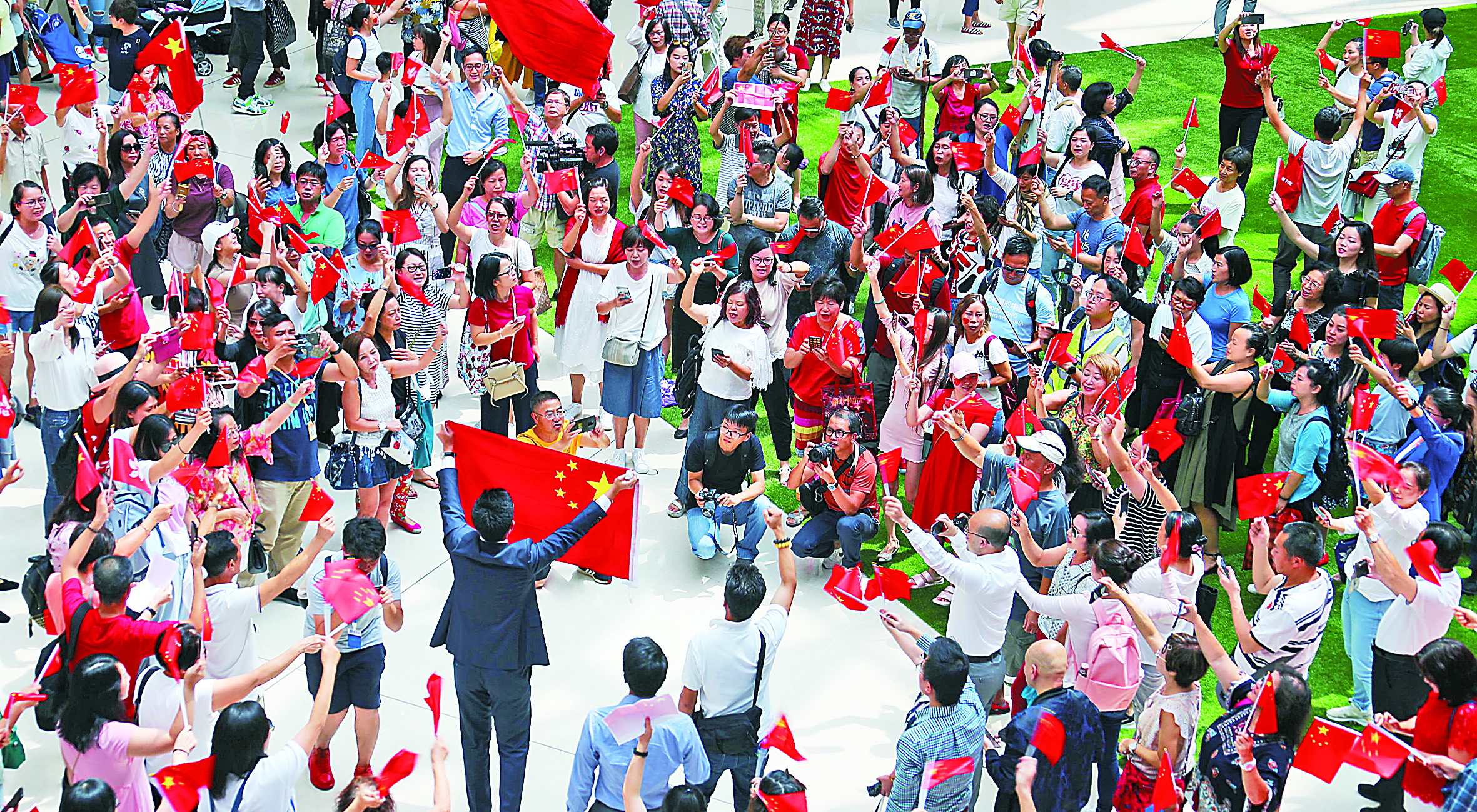 “把我们的血肉筑成我们新的长城!”“歌唱我们亲爱的祖国,从今走向繁荣富强!”12日,在香港国际金融中心中庭大厅里,虽然计划时间是13时开始,但在12时40分左右已经聚拢了六七百名香港市民。他们摇动着手里的五星红旗或香港特别行政区区旗,情不自禁开始唱起了中华人民共和国国歌和《歌唱祖国》。
