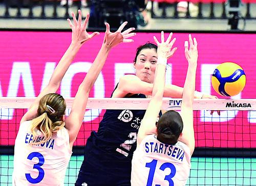 ◀9月16日,中国队朱婷(左)在比赛中扣球。
