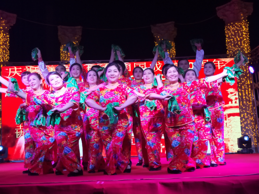 联谊会通过歌曲、舞蹈、乐器演奏等多种形式,展现了新中国成立70周年以来人们的幸福生活。在响彻云霄的锣鼓声中,联谊会拉开序幕。独唱《今天是你的生日,我的中国》,唱出了华夏儿女对祖国深深的祝福。鑫源物业人员集体大合唱《歌唱祖国》,在鲜艳的五星红旗下,他们歌声嘹亮,唱出了对祖国的热爱之情。舞台下居民挥舞着手中的五星红旗,沉浸其中。随后,演员们还演唱了《我们的中国梦》《领航新时代》等歌曲,讴歌新时代,唱响中国梦。在节奏轻快的《祝福》歌声中,身着漂亮服装的阿姨们登台舞起来(上图),吸引了很多小朋友也跟着跳起来,真正体现了“幸福大运城 小区嗨起来”这一主题。