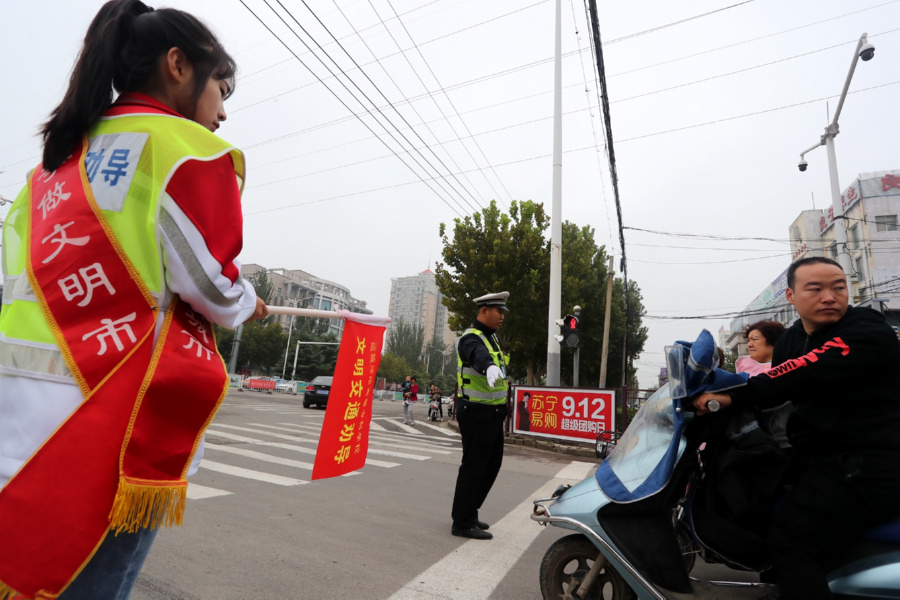 9月18日,盐湖交警大队三中队民警和志愿者在市区条山岗路口劝导市民文明参与交通。
