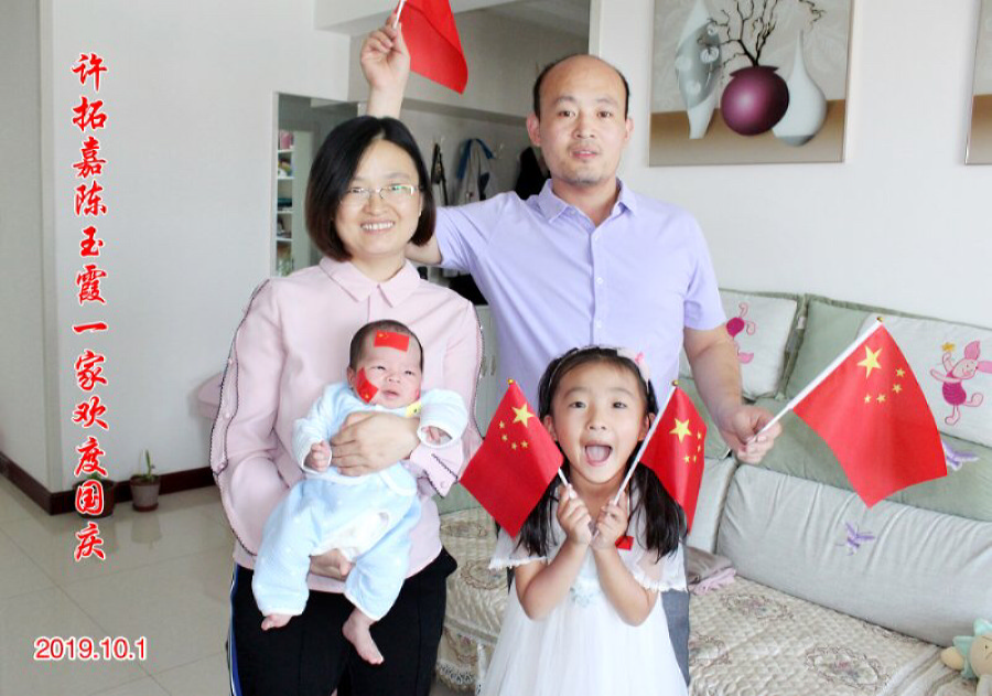 9月22日,空港某小区居民许拓嘉和爱人陈玉霞,以及女儿许宸薷、刚出生23天的儿子许宸阳,或手持国旗,或脸贴国旗,正在拍红色全家福。