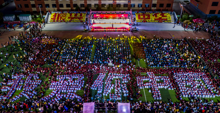 活动中,理想学校800名初中生在观礼台用扇子摆出了“1949、2019”“振兴中华”等巨幅大字。运城中学理想分校800名高中生,摆出了“我爱你中国”五个大字,吸引了许多观众摄影留念。理想学校70名学生代表还为老人们系上了红围巾。