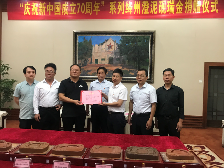 23日上午,捐赠绛州澄泥砚系列套砚仪式在瑞金中央革命根据地纪念馆贵宾室举行。馆长周景春代表瑞金方面接受捐赠并颁发捐赠证书。周景春说,运城和瑞金虽然远隔千山万水,但因为人民军队有了渊源,瑞金是红军长征的出发地之一,运城则是红军改编为八路军后,总部和三大主力东渡黄河奔向抗日前线的出发地。全国劳模、首届中国轻工“大国工匠”、中国制砚艺术大师、国家级非遗绛州澄泥砚代表性传承人、新绛县绛州澄泥砚研制所所长蔺涛在赠砚仪式上表示,瑞金是共和国摇篮,人民共和国从这里走来,值此新中国成立70周年,我们就想代表运城,代表全国的工艺美术界向红色故都瑞金致以最崇高的敬意。