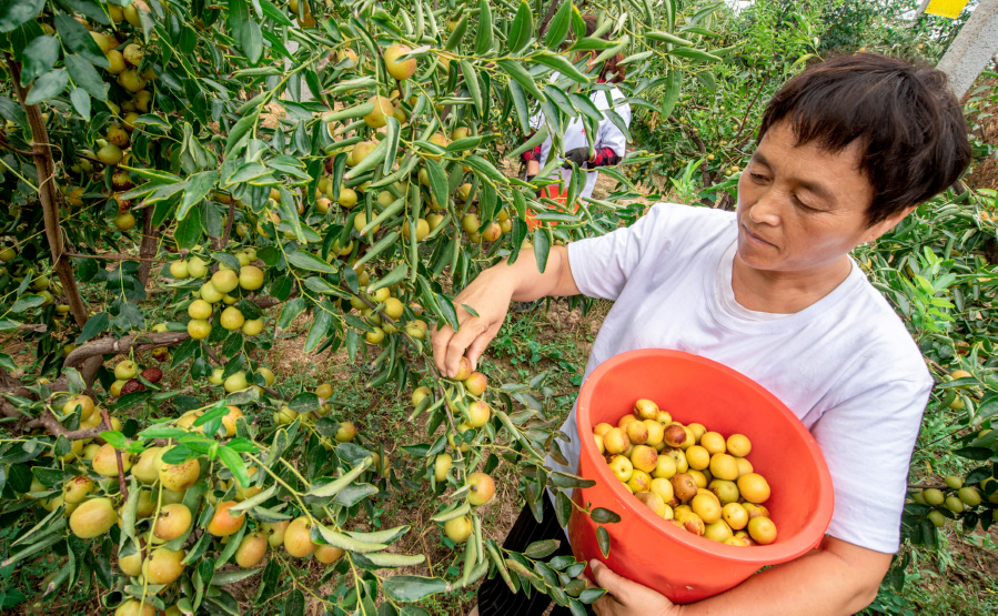 ▲9月20日,临猗县世隆专业合作社理事长赵惠玲带领合作社妇女在采摘有机冬枣。