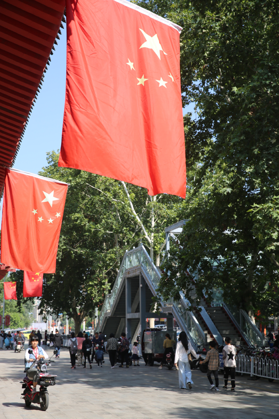 9月22日,永济市舜都大道一隅,商家门口高挂的一面面五星红旗,在蓝天白云的衬托下,显得格外夺目。