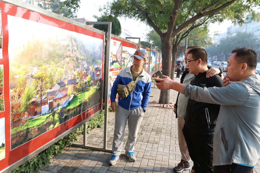 9月25日,几位摄影爱好者在摄影作品展板前欣赏交流摄影作品。