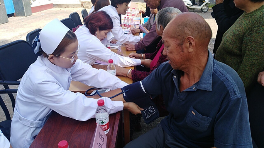 当天,医护人员为村民测血压、查视力、普及健康知识等,让村民不出村门享健康。
