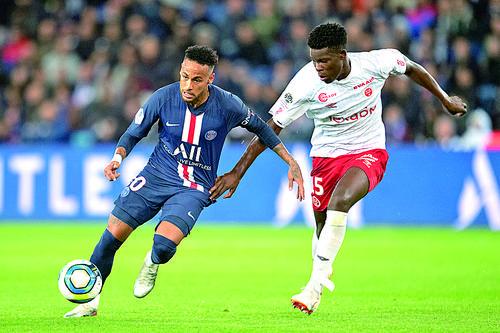 ▲9月25日,巴黎圣日耳曼队球员内马尔(左)和兰斯队球员穆内西在比赛中拼抢。 当日,在2019-2020赛季法国足球甲级联赛第七轮比赛中,巴黎圣日耳曼队主场以0比2不敌兰斯队。
