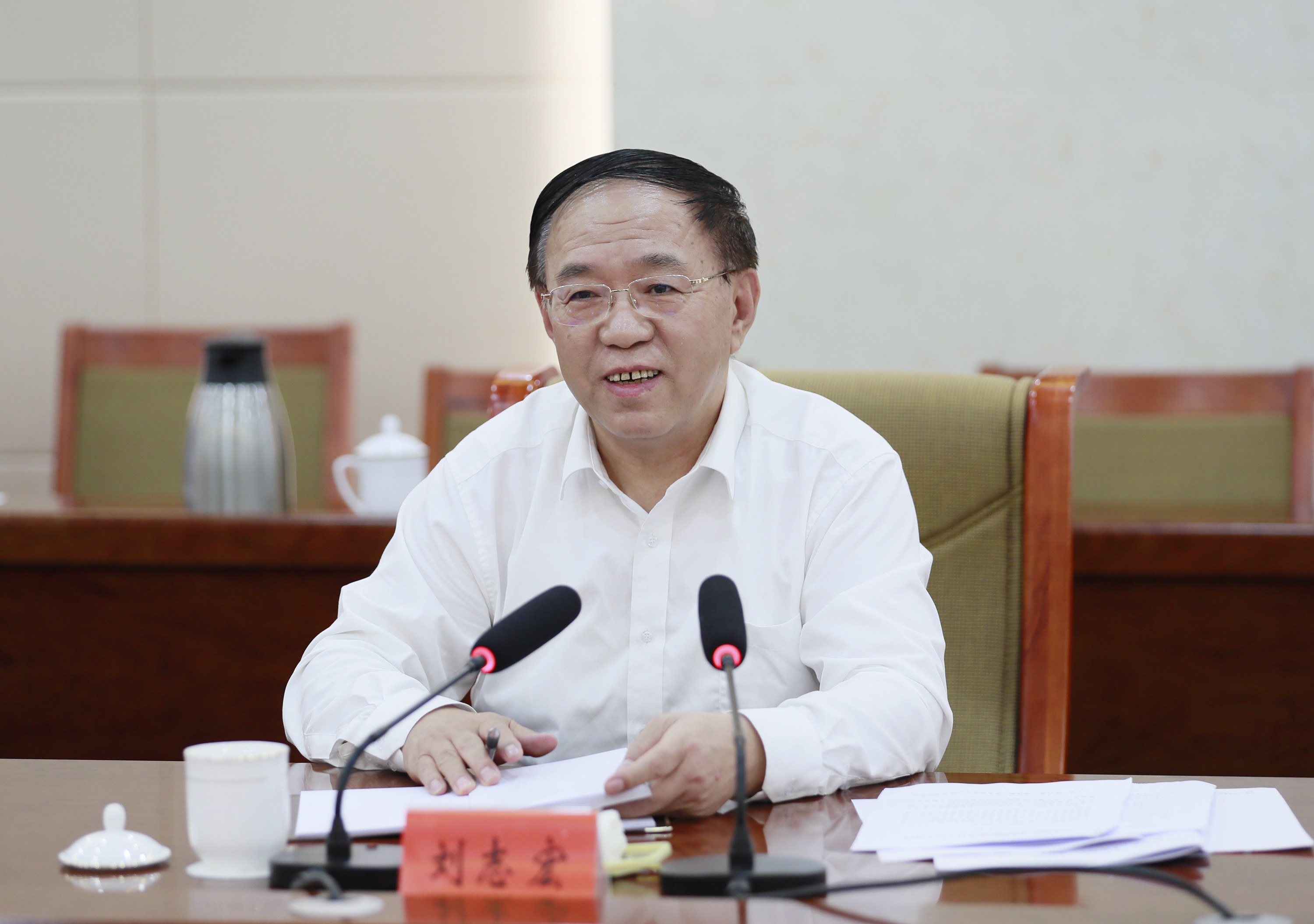 市委书记、市委主题教育领导小组组长刘志宏主持座谈会并汇报我市主题教育开展情况。 记者 闫鑫 摄