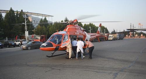 ▲多部门配合,将伤者送上直升机。 贺晓峰 摄
