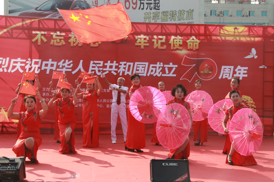 大合唱《没有共产党就没有新中国》《共筑中国梦》拉开演出序幕,唱出了居民对党的无限热爱之情;舞蹈《我和我的祖国》向祖国母亲献上真挚的祝福;音乐快板《赞盐湖》,诉说了家乡日新月异的发展变化,表达了对家乡、对祖国的赞美之情。此外,太极、乐器等丰富的表演形式,进一步激发了广大居民的爱国热情。演出持续两个多小时,在集体合唱爱国歌曲《歌唱祖国》中落幕。