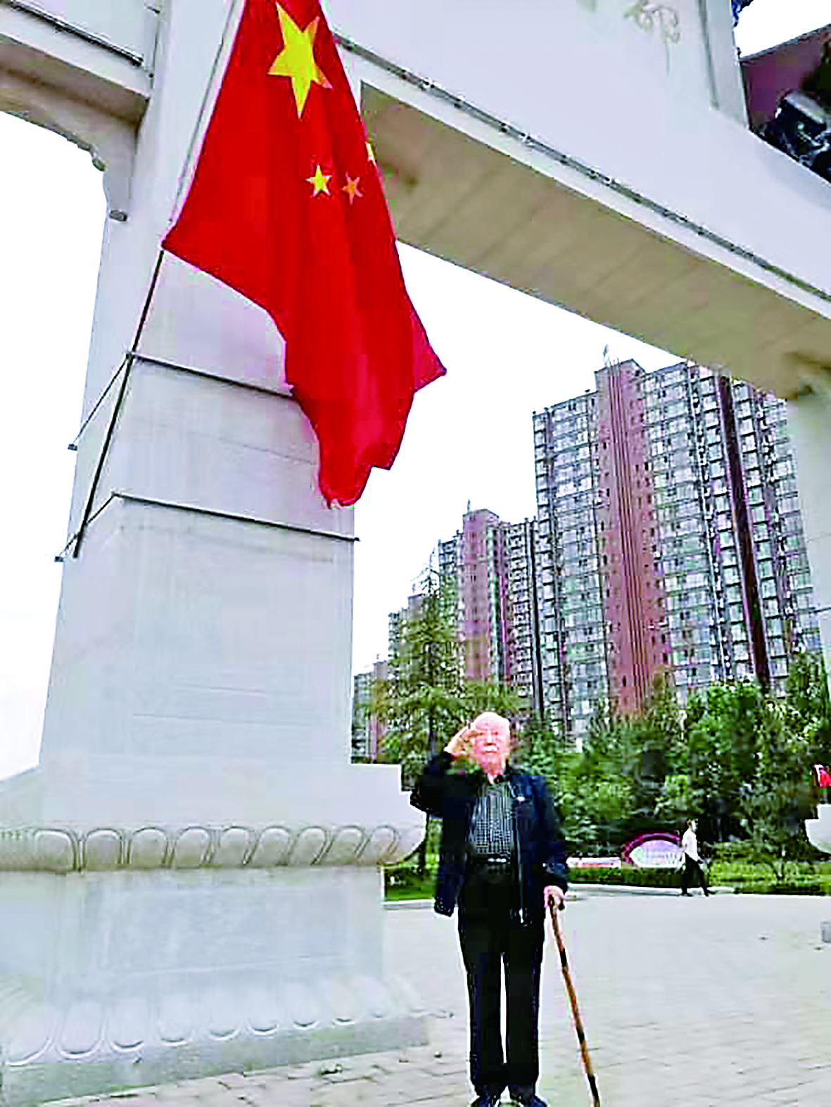 ▲10月1日10时,在市区禹都公园,90岁高龄老党员、离休干部李志民向国旗敬礼。