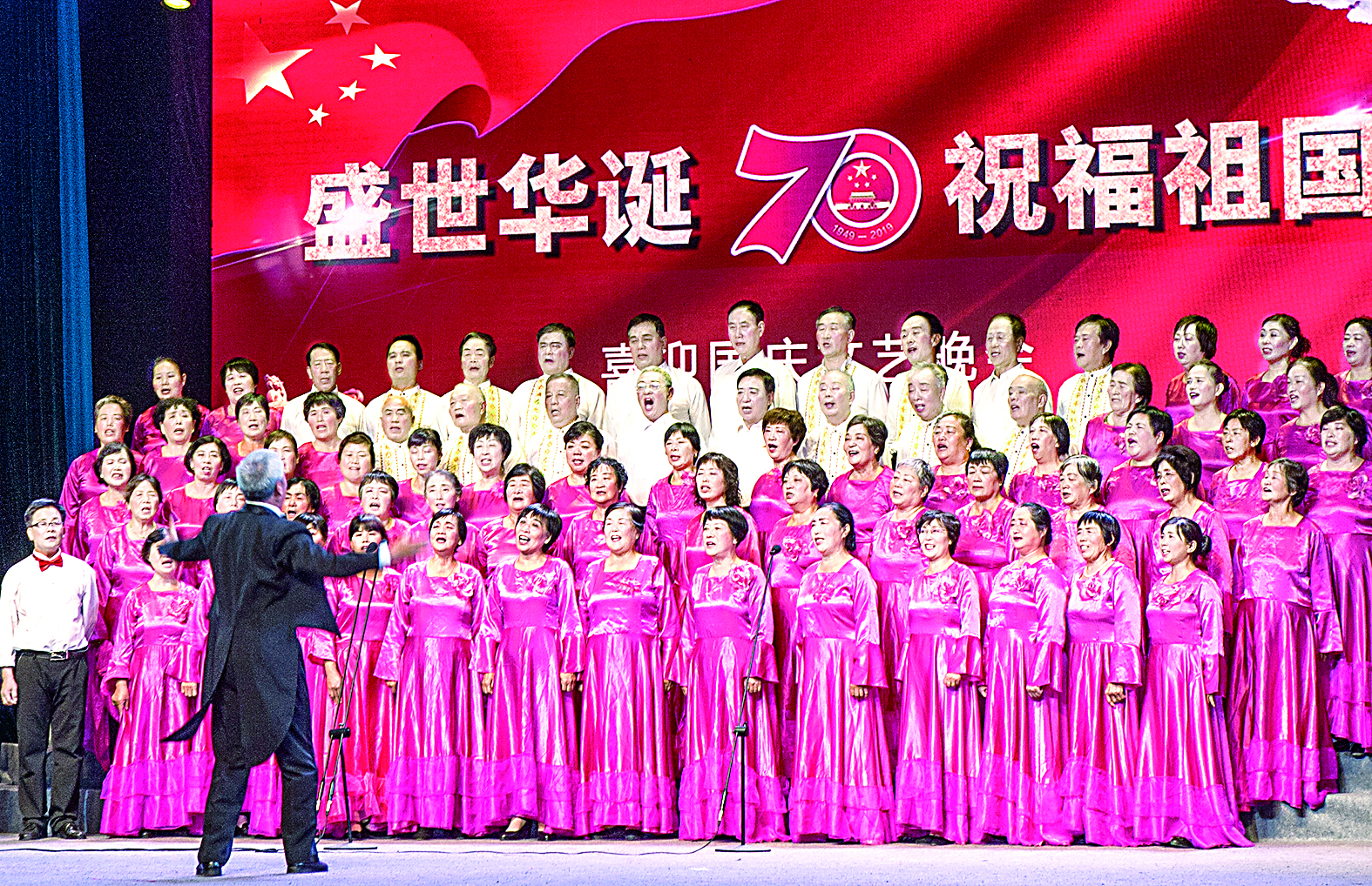 9月29日晚,万荣县老年大学的学员在舞台上表演大合唱《祖国颂》。