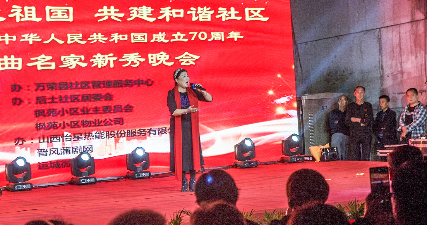 9月28日晚,中国戏剧梅花奖获得者、国家一级演员武俊英在万荣县枫苑小区为观众演唱精彩的蒲剧选段。 在中华人民共和国成立70周年之际,由万荣县社区管理服务中心、后土社区居委会和枫苑小区联办的“感恩伟大祖国 共建和谐社区”庆国庆戏曲晚会举行。